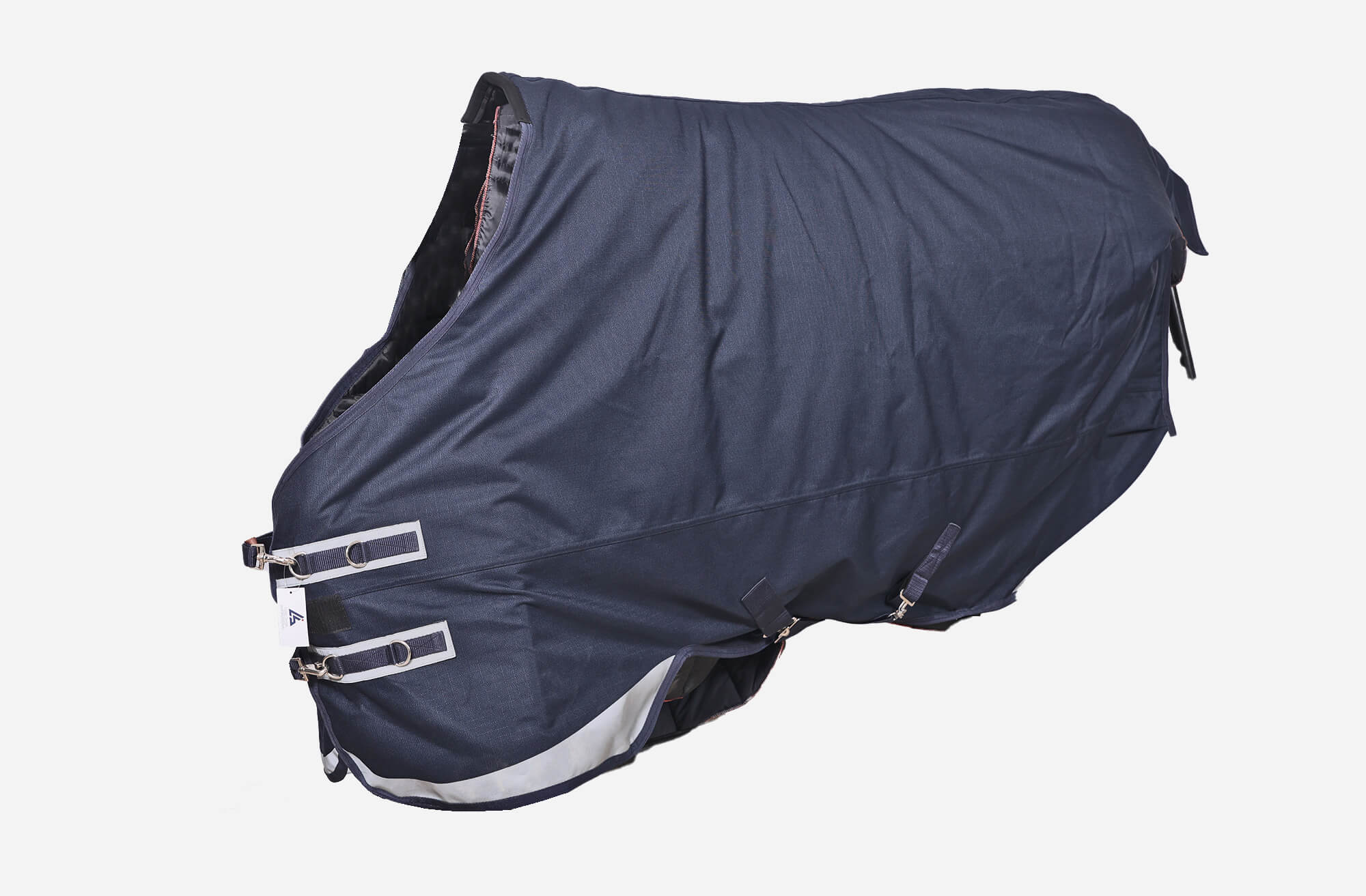 Regular Neck Turnout in Upper 1200D Fabric, Lower Fabric 210T Nylon, 200Gsm Poly Fill quilted with 6” Strength Line Channel Quilting, Double Front Buckle with Quick Adjustment & Velcro Assists, Windproof, Waterproof, Breathable, Criss cross surcingle, Removable Elastic leg straps. Umbrella Tail Flap, Wither Relief In Neoprene. Bottom Part with Cut Shape with Reflective Fabric Stitch, P.P. Binding All Over. Packaged in a Barcoded Resalable Bag with a Barcoded Hang Tag.