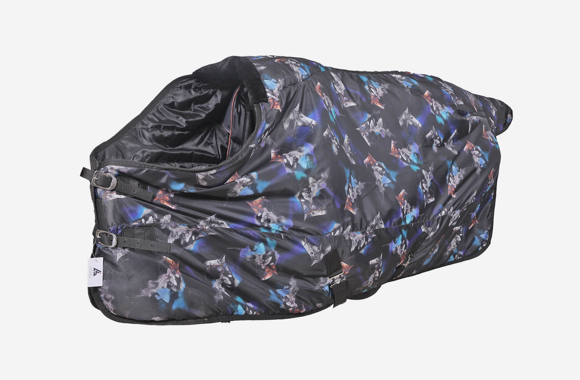Printed Stable Rug, Upper 3D 300D Fabric, Lower Fabric 210T Nylon, 200Gsm Poly Fill quilted with Strength Line Channel Quilting, Two Front Normal Buckle Closure, Low Cross Surcingle, Leg Strap Elastic, Mink Fur Collar. Packaged in a Barcoded Resalable Bag with a Barcoded Hang Tag