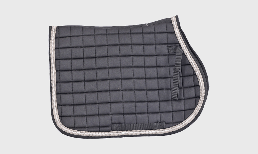 Saddle Pad. Upper Fabric Polyester Drill, Lower Fabric Cool Mesh, Quilting w 5Mm Foam +200Gsm Poly Fill. Same Fabric Binding in All Over, Two Front Strap And Both Side Handle., Three Twisted Cord Fashion in All Over.