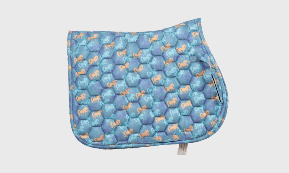 Saddle Pad, Upper Fabric Printed Polyester Shiny, Lower Fabric Cool mesh, Filling 10mm Foam, 200Gsm Poly Fill, Both Side Strap and Handle, Same Fabric Binding in All Over.